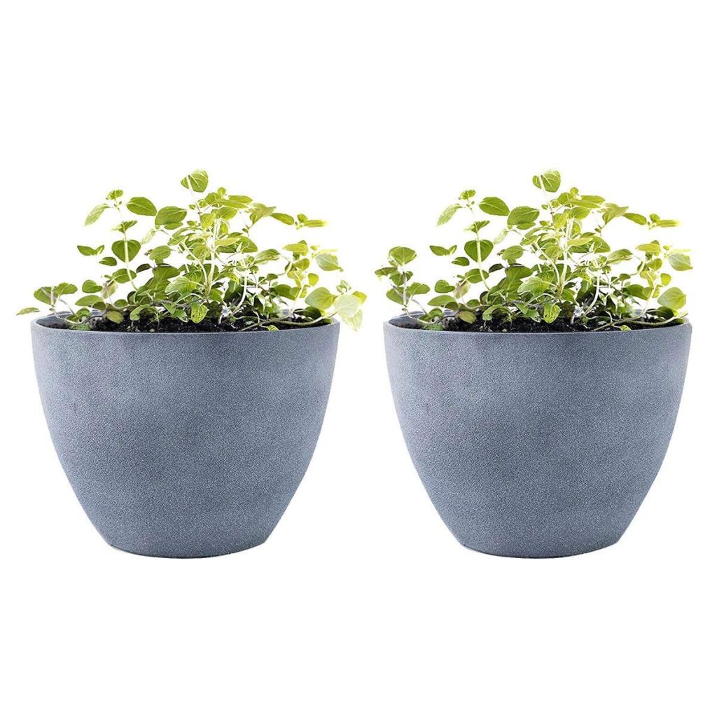 Resin clay flower pot provides great growing conditions for plants as its natural porosity allows the pot, compost & plant roots to “breathe” whilst assisting in reducing the likelihood of overwatering. The color is predominantly pale grey.